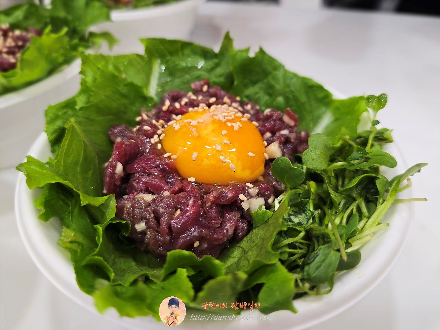 한쪽에서는 메일 비빔국수가 만들어지고 제가 있는 곳에서는 육회비빔밥이 만들어집니다. 밥은 오뚜기밥을 데워서 비빌 수 있는 조금 큰 용기에 다시 옮겨 담고 그까짓 거 대충 큼직하게 자른 채소를 밥 위로 나름 플레이팅을 해 줍니다. 그리고 육회는 참소스와 다진 마늘을 넣고 버무려준 후 채소 위에 살포시 얹어준 후 날계란도 이쁘게 올렸습니다.